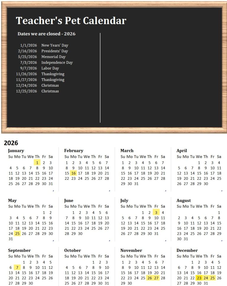 Teacher’s Pet is open all year with the exception of most major holidays. We are closed New Year’s Day, President’s Day, Memorial Day, Independence Day, Labor Day, two days for Thanksgiving, and two days for Christmas. We also close an additional day each year depending on where the major holidays fall on that year’s calendar. For example, in 2025 we will close the Friday after Christmas.